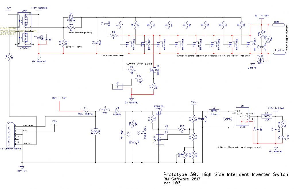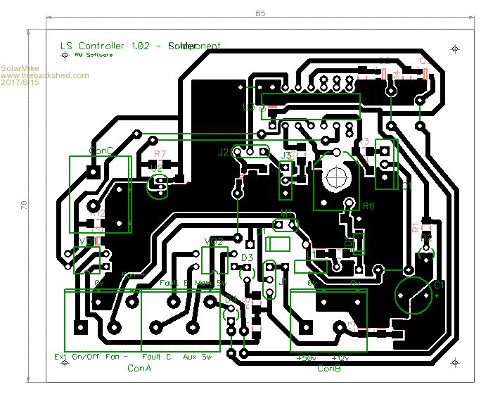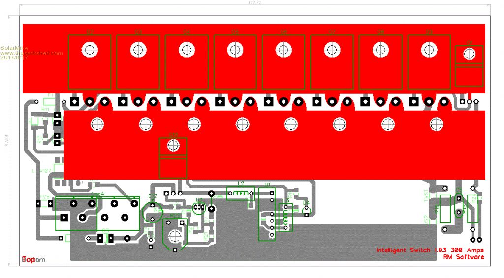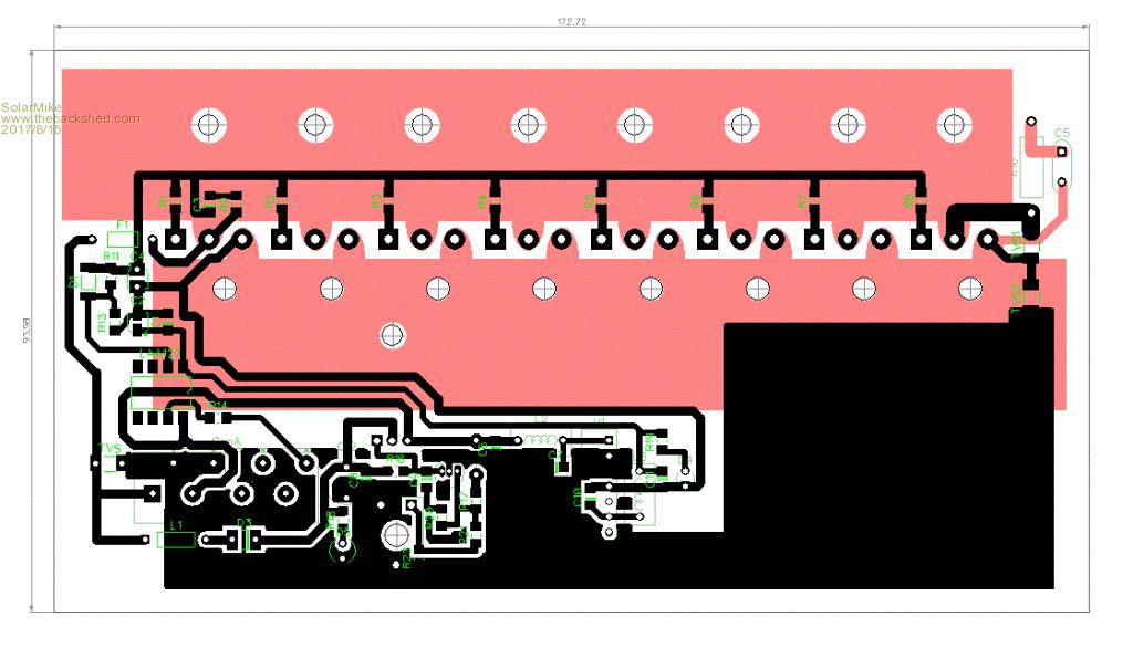 Wow, good discussion on the small power supplies, I havent looked at mine to see why it isnt working, intention is to take the transformer out and rewind it or perhaps design a new pcb using the components off the old board but with dual 12v and 5v isolated outputs. So for now have left the linear regulator and 12/12v isolator in place, so current draw on the linear reg will be minimal increasing proportionally with variable fan speed. Meanwhile have completed the proto design of main switch mosfet pcb and its piggy back Pic controller, try to use smd components where possible. The mosfet board has two 25 x 3mm copper bars bolted to the pcb on the top side with mosfets mounted direct on the bars, large flat strips of 0.25mm copper foil mount under the bars to give extra heat radiating surface area, the sources are clamped to the other bar using 4mm bolt and cupped washer, pcb shows mosfet solder holes... not used except for the gates., Bars will extend out sides of plastic housing with 10mm bolt holes. For this first cut both boards can be used single sided. Mosfet Board: Controller: Cheers Mike |
