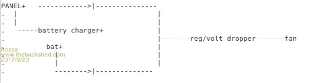 Seriously, I'd try that two diode trick panel (+) connects to battery charger (+), from bat (+)(diode K), diode A to your voltage drop/reg (+) panel (+) also goes to other diode K, other diode A goes to voltage drop/reg (+) ![]() AFAIK that will keep the voltage reg/dropper to the fan fed from the panel whilever the panel voltage exceeds that of the battery, once the panel voltage drops under the battery voltage, it will start feeding from the battery instead worth a try at only two diodes.... |