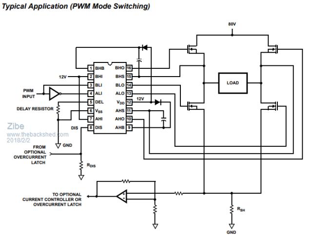 I am using the HIP4082 H-bridge driver, it’s a pretty handy IC and has built in deadband control and shoot through control. I am using only two of the control pins for the low side control (in this configurations the high sides output is a negation of the low side) as per the following example from the datasheet and timing diagram.