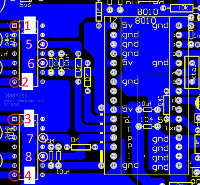 The pins marked 5 & 6 will both have squarewave signals and 7 & 8 will have the fuzzy SPWM signal. 5,6,7 & 8 are the signals coming from the EG8010, so if you have these signals the EG8010 chip is working but it will be shutting down after 3 seconds as it is not detecting any voltage feedback. If you just have the power board powered up on its own you will get a square wave on the IR2110 on the pin marked 1 in the diagram below, 2 will have a very weak barely visible output, 3 will have a fuzzy wave that is the SPWM(sinewave pulse width modulation) pin 4 will also have a barely visible signal. If there is no out put at all from the IR2110 check that the 13V power supply is working.
