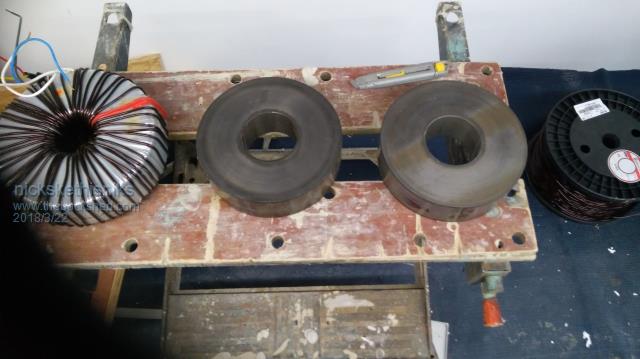 I did a sample and I found the 3.55 wire rather soft/bendable. On the left the transformer has now +/- 356 secondary turns, and 52 primary turns ( needs fine tuning during testing). The primary will be good for 40A. It will have low idle current, we will see how that turns out, at least I have a testing transformer. @ the right you can see the 42kg of 3,55 wire, don't ask... .