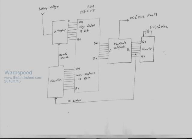 Here is my most recent idea for the simplest possible hardware only pure sinewave PWM generator. ![]() The idea here is that we use a very large ROM to store multiple 1K lookup tables. Each lookup table cycles through 1K fifty times per second using a 51.2 Khz clock. The data output of the ROM is compared to a high frequency counter to produce 25.4 Khz PWM with an 0-100% duty cycle. A digital voltmeter reads the dc battery voltage coming into the inverter, and selects a suitable lookup table to keep the amplitude of the PWM going into the transformer primary constant, regardless of any changes in battery voltage. Just as an example, we could easily cover a 2:1 input voltage by only using the upper half of the ROM addresses (giving 128 different lookup tables). The voltmeter would measure the incoming dc voltage once only at each zero crossing to select an appropriate lookup table for the next mains cycle. This has both advantages and disadvantages. The advantages are extreme speed of response, with total stability. Under very heavy loads the transformer output voltage is going to fall slightly, but hopefully not by enough to be a problem. The main challenge an inverter faces are large voltage changes at the dc input created at the battery. Many improvements are possible such as adding slow integral output voltage correction, or using more of the available ROM. But the aim here was to come up with something really simple using the fewest possible parts. Cheers, Tony. |