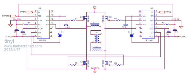 Tinyt, dead time will be taken care of automatically due to the design of the IR21844 chip. With zero resistance of dead time setting pin 4 that is connected to ground (pin 3) the dead time will be about 400nS 200K ohms will give about 5uS. I set it at about 1uS in my current design. As a first approximation, just ground pin 4 to set DT to 400nS and see what happens. Again, the value of having a modern DSO is clear because you can hook up both LO and HO outputs to the scope and see the complimentary outputs and dead time. wronger than a phone book full of wrong phone numbers |