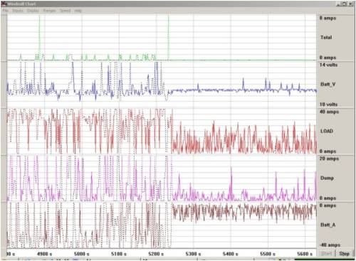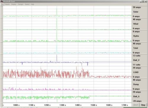 I have built a PWM Controller with a data logging feature to complement my development of DIY wind and water power generation units. Unfortunately, in spite satisfactory bench testing, it does not perform to an acceptable standard when installed into my power system. The problem seems to stem from the power demands of the inverter with a rapidly fluctuating current and an associated fluctuation of battery voltage that worsens with increased power demands . This makes it near impossible for the controller to adjust to a relatively stable duty cycle or log usable data over a day.
