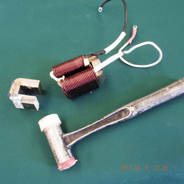 Next, using a soft faced hammer and holding the choke in the hand tap one protruding core half side on. Repeat with other side and other core end until it is loose and can be pulled out of the winding. The cores have a 2.5mm plastic 'air gap' spacer so they separate relatively easily.