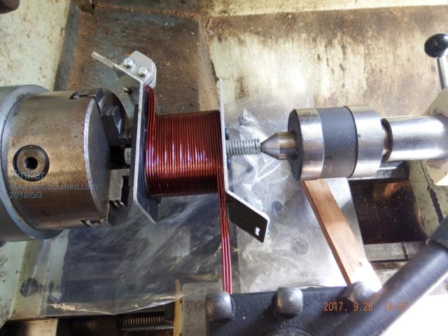 The friction of the threading gears prevent the chuck from backlash so the wining can be stopped at any time without the wire unwinding. I managed to fit 9 turns (3 in hand) on one layer. These now need to be epoxied in place before trimming the toolpost clamped ends. Do place some plastic under the coil to prevent epoxy messing up the lathe bed .
