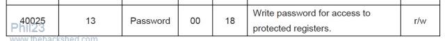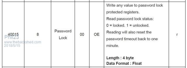 Are you definitely writing to a single register? not a conscutive pair like in float. Nup I am out of ideas, I had the impression that password protection was not switched on by the manufacturer. I'm confused, no wait... maybe I'm not... |