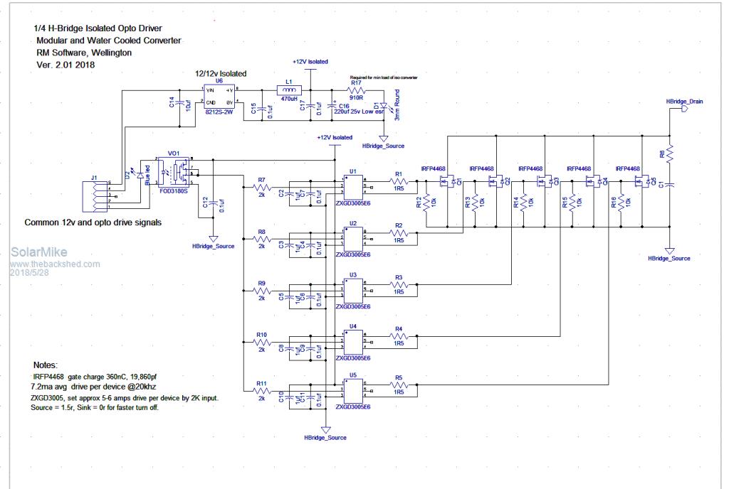 So two inverters, just different power requirements and high sustained peak power. Starting with the standard H Bridge design, have opted for a modular approach using isolated driver boards for each section. For mosfets have gone for IRFP4468 with 1-5 devices in parallel each driven by a high current totem pole driver. I like these totem pole drivers, they are cheap (50c), very small, can be mounted very close to the power devices and have independent control on source and sink drive currents. Each driver pcb is soldered direct to mosfet pins by a solder blob.