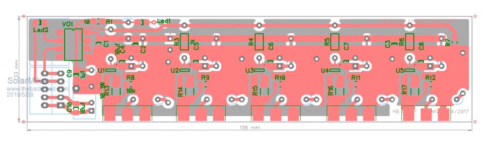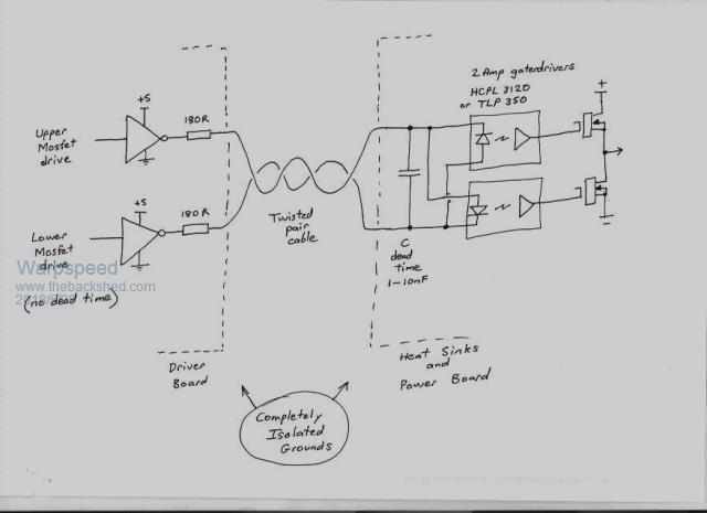 This is my own much lower power version of Mike's modular approach. It essentially follows Mike's design philosophy of complete optical isolation, and with continuously running isolated dc to dc power sources. (no common grounding, and no voltage pump for the upper driver)