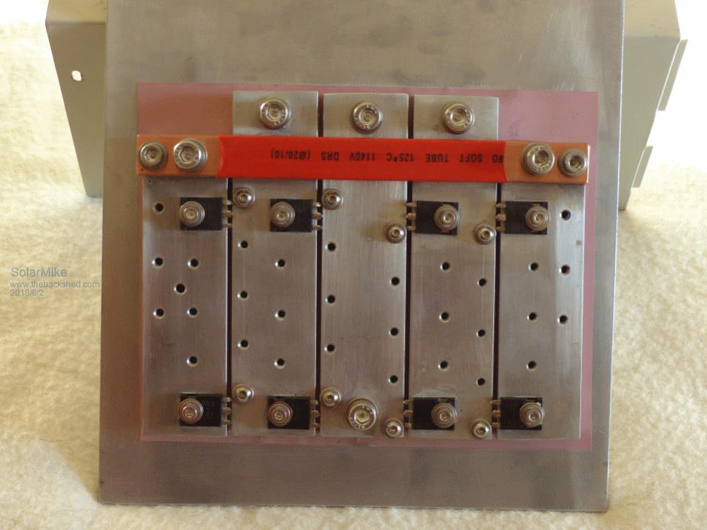 Mosfets are mounted on 16mm x 50mm alloy flat bar bolted to the base via a silpad for insulation with 5mm nylon countersunk screws. The bars carry power and with a good surface area for heat transfer to the base plate. Copper bar 90mm^2 joins the +ve connections, center is 0v, two others are transformer connections. Copper to alloy jointing compound is smeared on all connections prior to cleaning off oxides and clamping up.