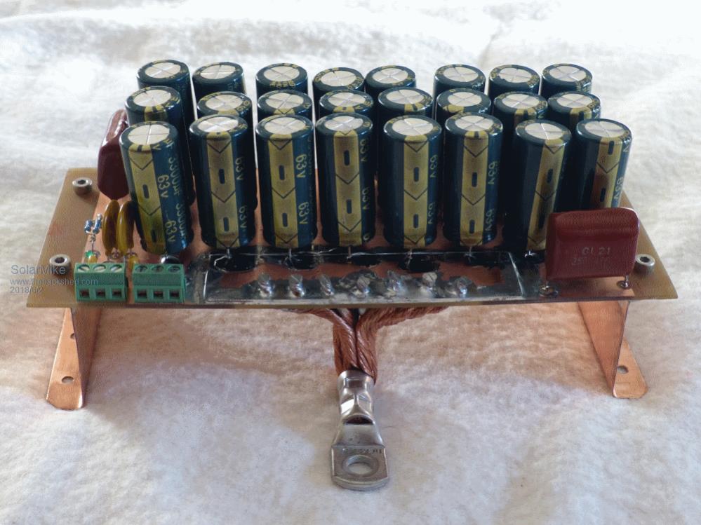 Decided to mount the capacitors on a pcb that sits above the mosfets, there are myriads of options here depending on what caps you have, big low esr types are very expensive, so have used many smaller ones in parallel, this has the advantage of good pulse current and thermal cooling, their esr's are all in parallel and coupled with a 1uf smd ceramic across each device gives a very low impedance capacitor bank; shown are 24 x 3300uf.