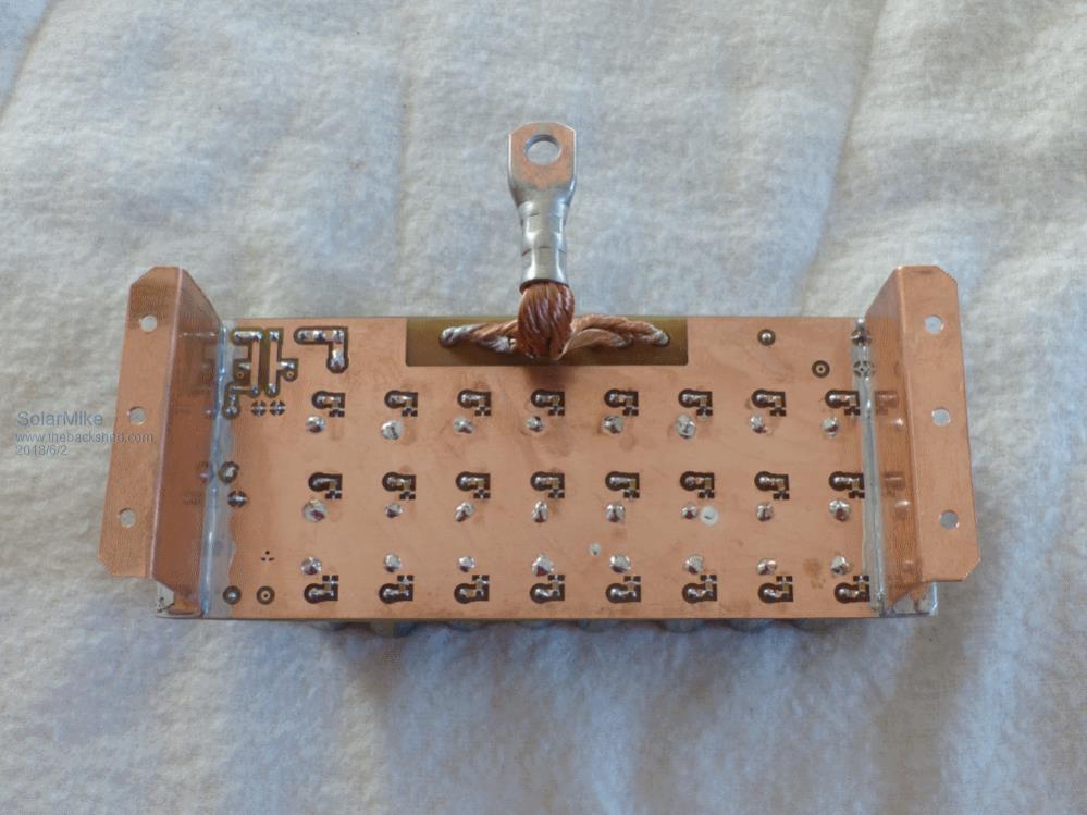 Mosfets are bolted to the bars with 4mm screws, source legs are clamped between two copper washers, other pins are chopped short and bent up on the ends for connections to the driver boards sitting across each row of devices, blob of solder makes each connection.