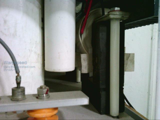 Here is a rear view showing the three flyback chokes. The 3mm sheet rubber air gap is well clear of the windings which I think is probably why they work as well as they do completely free of voltage spikes or ringing.