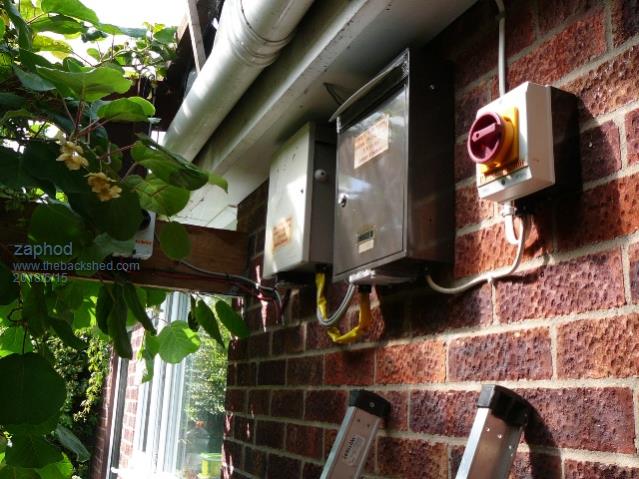 Here are some pretty pics of the installation so far, first on a wall under a permanent open sided lean too roof. Brown box on the right is the new CSI with it's AC isolator, grey box to the left is hot water boost converter with its DC isolator to it's left on the wooden beam. 2nd picture is the innards of the CSI box.