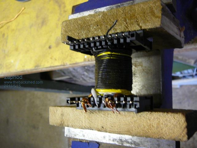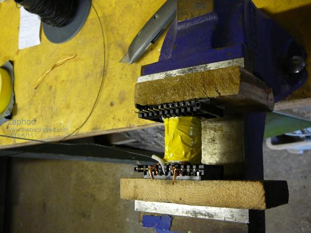 Here are some pictures of the transformer under construction first is whole primary (in litz) wound on top of half secondary. 2nd is after that was taped up (get's progressivly lumpier with each layer unlike the pro's ). 3rd is after 2nd half of secondary is wound, black wire is in fact TIW with heavy insulation. Last picture is completed transformer before application of Farady screen. I should add it's important to ensure winding end turns are adiquietly insulated and protected from abrasion, I use fiberglass tube, as it's often here the voltage stress is the greatest and choose the pinouts to ensure adiquite seperation and pcb layout (if your using one).