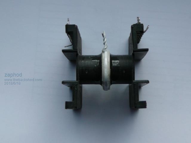 The output of this inverter consists of an LCL filter, as previosly mentioned sine modulation is carried out on the primary side so the first L operates in both discontinuous and continuous modes hence it's ripple currents can be very high. Consiquentially it is wound in Litz and is an gapped ETD core (N87 again) as no sensible ring could both provide the inductance and be of a low enough loss. A problem aluded to by Warp is the gap is designed to be entirely in the centre pole under the winding and without some management will cause winding heating. In my case I made a spacer in the bobin to force the winding clear of the gap (see 1st pic), wire is just retention while the glue sets. The completed inductor is in 2nd pic.