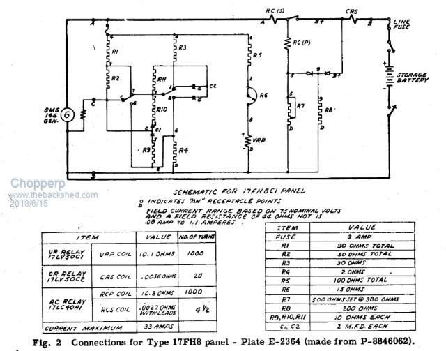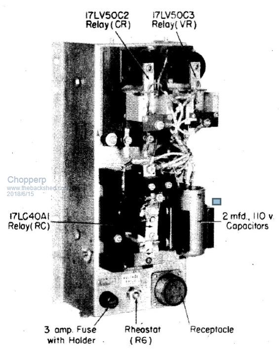 The current relay CR, is on the far left of the circuit & VR, the voltage relay is on it's right. (The cutout is at the top). There are some suppression capacitors with series resistors across the contacts which make the drawing even more confusing (for me anyway).
