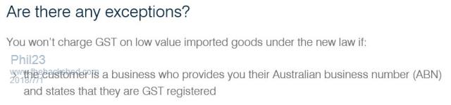Just received an email from Aliexpress saying this "From 1 July 2018, Australian goods and services tax (GST) 10% will apply to each order valued at A$1,000 or less, and AliExpress is required by law to collect such GST and remit to Australian Taxation Office." and this link. There are only 10 types of people in the world: those who understand binary, and those who don't. |