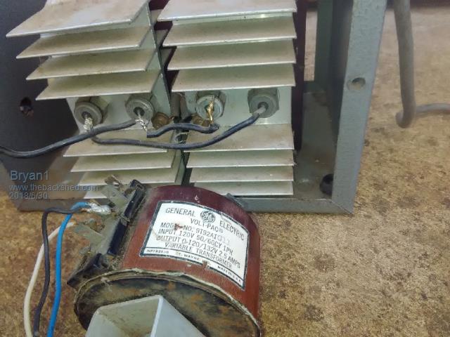 I scored this at a garage sale for $2 and thought if this works it can become a new variable power supply. When it got home well it was time to plug it in and with my Fluke 865 lets see if this thing works. As the pic shows only one wire is coming from the rectifier I used that as one lead and put the other one on of the heatsinks as one leg of the transfer is on each isolated heatsink. Got a reading of 32 volts DC and then I put the positive probe on the left diode and got 47 volts. Now one would assume the second leg of the 4 diodes is the negative and the first one is the positive.