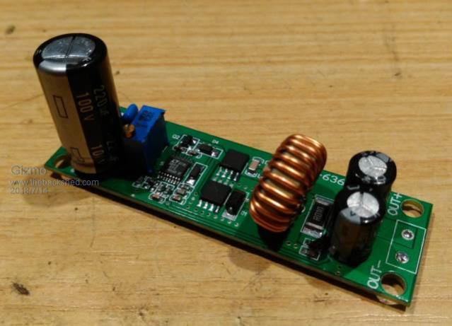 Because my battery bank is 48 volts, I used the buck converter to step this down to 12 volts, which I used to power the op amps, LED's and voltage meter module. The buck converter is rated at 60 volts max, but my battery voltage can reach 62 volts at times, which may pop the buck converter. I replaced the buck converts two 100uF 63v input filter caps with a single 220uF 100v cap and a 0.1uF bypass cap, and connected 4 1N4004 diodes in series with the input to drop a couple of volts. This should give me a safety margin.