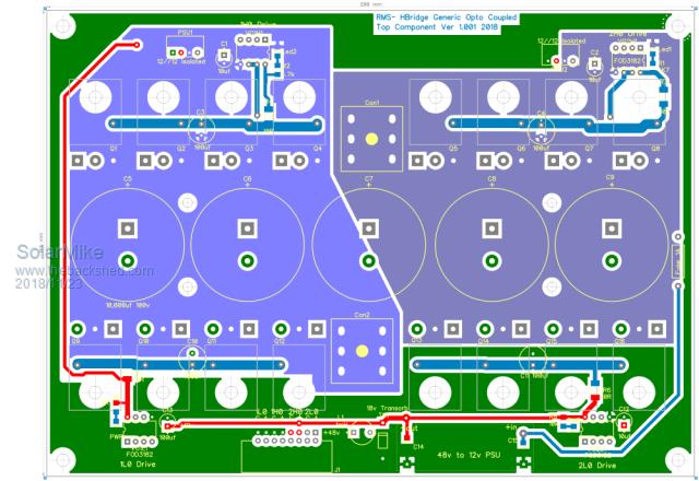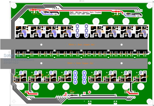 Thus the layout below, sorry no schema, I just built the pcb design as is, thought would just build a generic opto-coupled H-Bridge that can also be used as an inverter. 4 mosfets on each leg, they are mounted under the board on an alloy plate for heat sinking, each device has its own driver chip. Copper bars are soldered along the +- rails. Plug a cpu board into it to suit whatever function is required. Cannot wait to try out Poida's Nanoverter driver on it with a toroidal core.