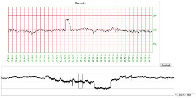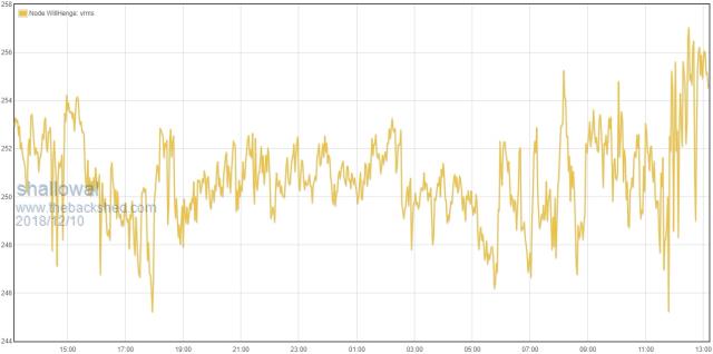 ![]() This a typical day on the mid north coast NSW. Sometimes it ranges from 236 to 262, but in general stays in the mid 240's to high 250's. A little while back a local had their TV soundbar go on fire, presumably from over voltage in this area. Allan |