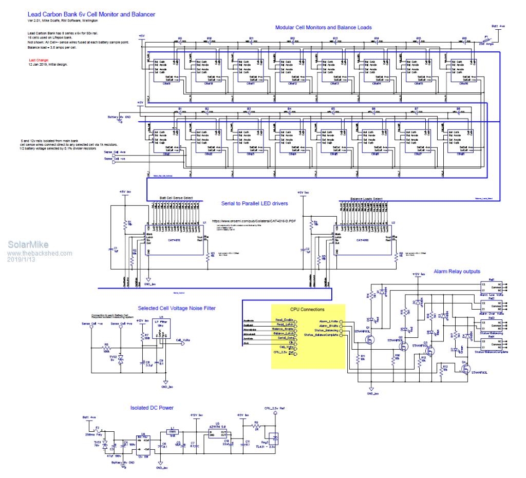 In the process of re-designing my battery management system, now that we have moved to Lead Carbon Cells @6 volts, 8 in series for the 50 volt bank; the Lifepo4 BMS design needs re-visiting. As an aid for initially getting all 24 of these batteries to the same state of charge prior to assembling the bank, I want the BMS to have a cell balance load capability of 3.5 - 4 amps. This will allow connecting up any 8 cells in series to a current limited fixed voltage supply, the new BMS will ensure they all charge evenly and still charge reasonably quickly, will use a 300W PV panel + small up-converter as the charger (no AC power on site). Have decided to make this system modular, the cell sense balance boards especially are all identical, for 6v cells only require 8 monitor points, however if someone else wants to use 3.2v Lifepo4 then 16 will be required. Initially was going to construct a small pic based cpu board placed across each cell in the bank, with opto connected serial bus to talk to a master controller. But having made the decision to have a high dissipating cell balance load it makes better sense to run suitably rated wires to each cell via a 10 amp fuse and multi-pin connector on the other end; plug this into a central unit with large heat sink + fans etc. This setup has the advantage of allowing changes to the system without having to mess around in the battery bank eg. there was some discussion here last year about transformer balancing, still want to do this, and easier to accomplish having all electronics in the one place, just swap out the balance boards with new ones. Here is the design for each cell sense\balance module, they will sit vertically and plug into a mother-board. Each cell module is opto-coupled to the mother-board driver, using optimos switches to select each battery cell in the bank, if the main driver is also running off an isolated power rail then essentially the driver is connected directly across each cell. OnSemi make some neat LED driver chips that are serial driven, they make connection to the cell modules very easy, a single resistor selects the led current to the module opto-couplers. Will have the CPU board plugin also to allow a PIC or Arduino etc. 2019-01-13_162248_BMS_DriverSchematic.pdf The driver-CPU board floats up and down across the battery bank, so any external connections to it will have to be via data-bus isolators or opto-couplers. Cheers Mike |