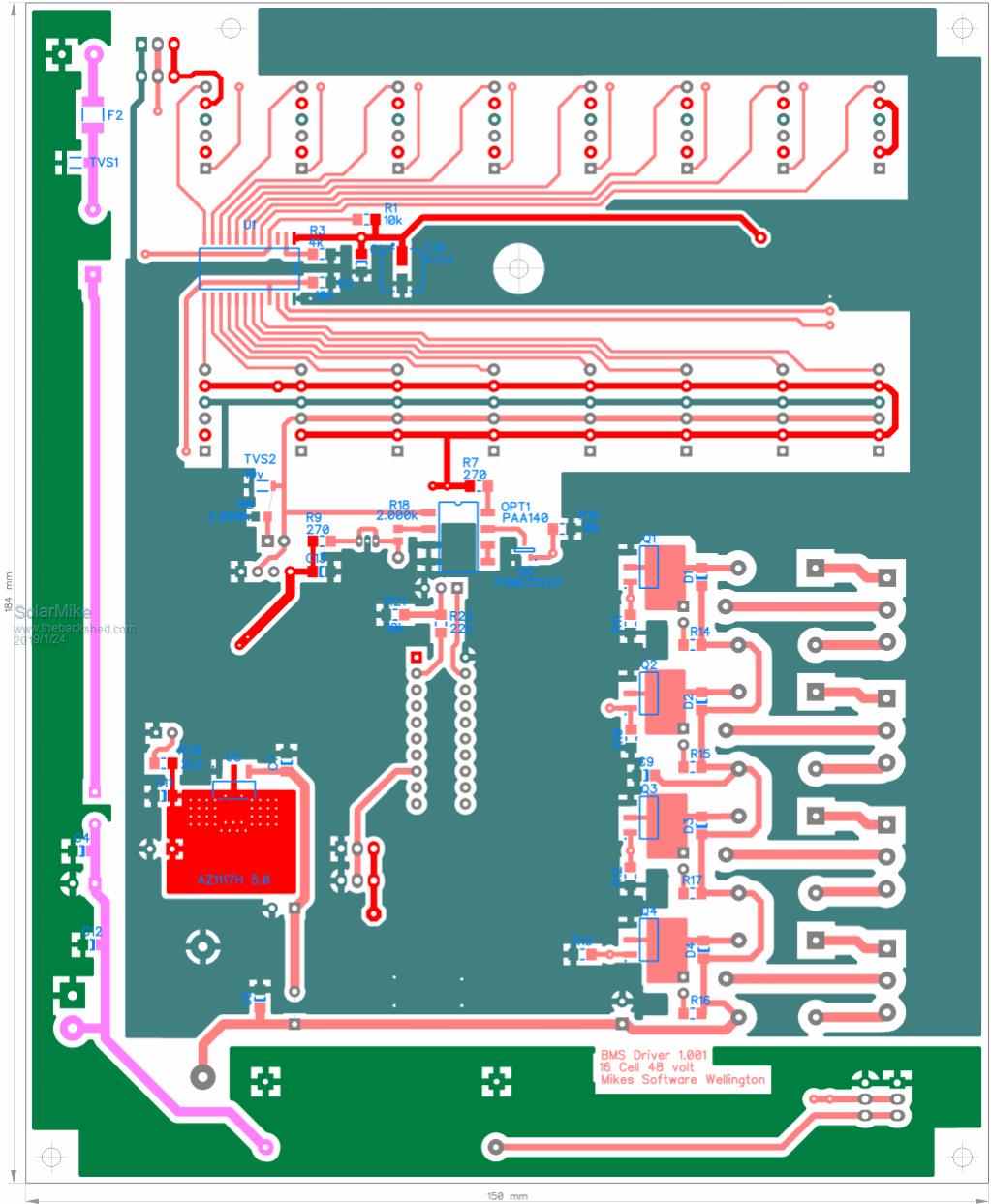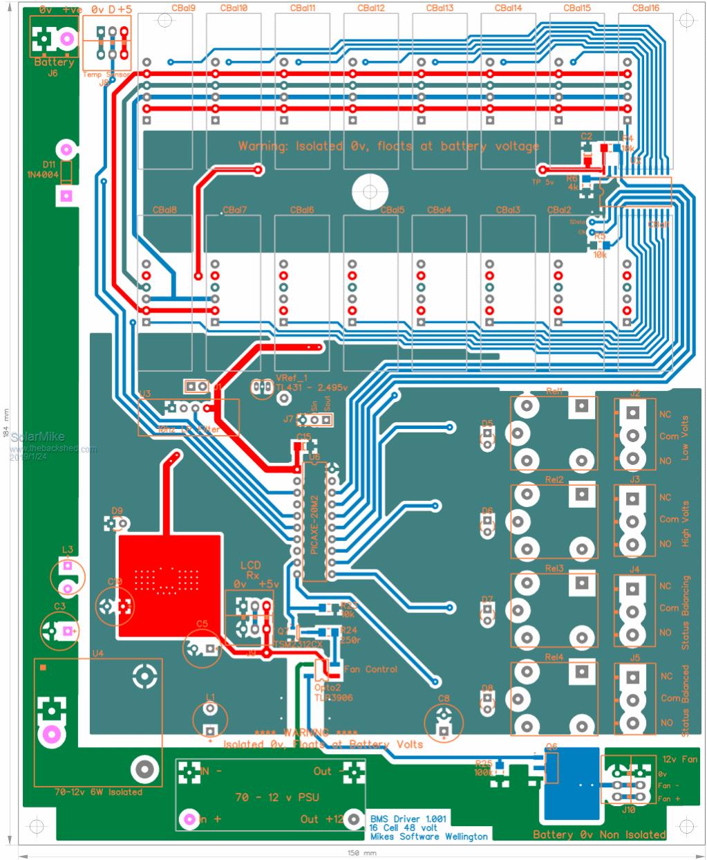 Took awhile to do the PCB layout, bloody rats nest of connecting wires everywhere, having the battery sense component connections as plugin modules helps a lot. In the end used a Picaxe 20M2 cpu, all IO's used bar one. If I want to export the battery cell data to a master unit, will have to use a cpu with more IO's, 28X2 or similar and use opto couplers or data-isolator's onto something like a 1-wire bus. I think I need to start using Arduino chips, these Picaxes are quite expensive especially the 28/40 pin versions. TOP: ![]() Bottom: ![]() Cheers Mike |