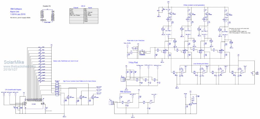 Alarm unit runs off the 24v batteries. Wanted to have perimeter alarms that are thin wires running through various fences etc, the wires will have series connected leds that wink to indicate alarms are operating, should any wire circuit be broken by cutting a chain\padlock etc then the unit detects this and sounds the piezo screamers\flashing lights etc. Various internal PIR sensors are included also. Will also add a device to send a txt message when tripped.