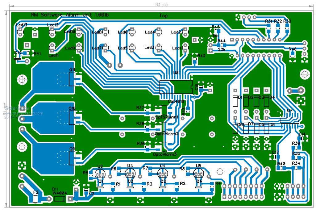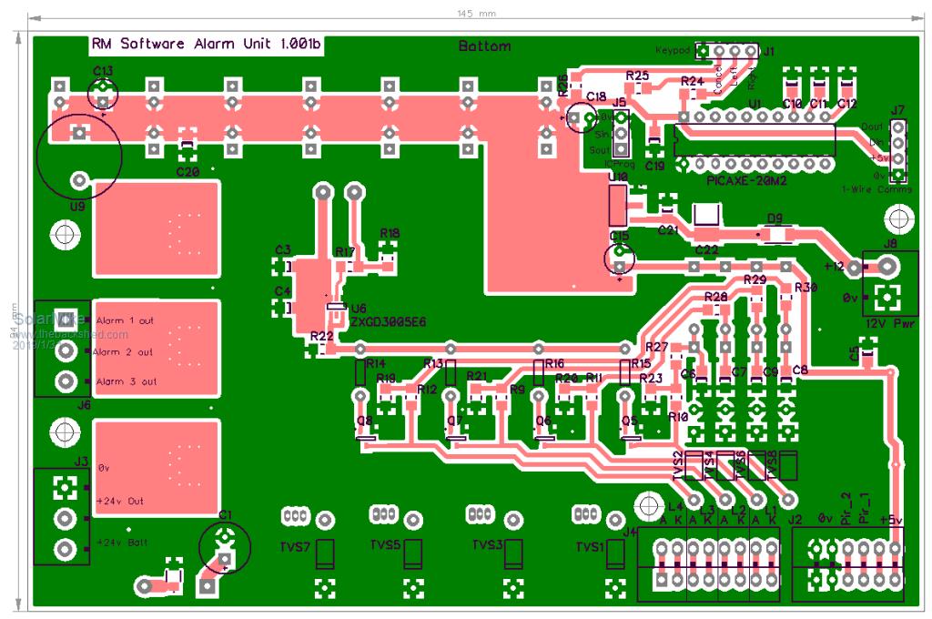 Finally completed the pcb layout, its a bit crammed in places as I wanted it to fit in a case that I had lying around. Original circuit altered somewhat, now using the 16 bit serial to parallel Led driver for status display of sensors and external wire loops, this allows me to use a 20 pin pic and have 2 IO's left over, so added a 1-Wire comms port to allow the alarm to be integrated with the site network used by the soil moisture sensors. Comms module plugs in to the 4 pin connector. In theory once the network master is built it can get the alarm status and elect to send a TXT message to security company. Edit: or make a 1-wire slave to do this job.