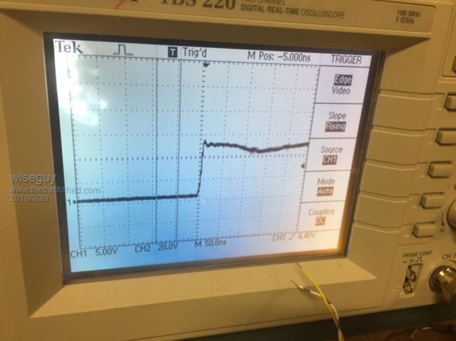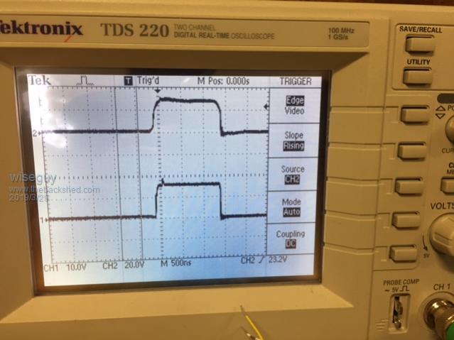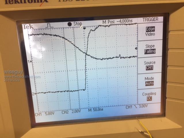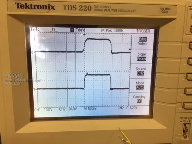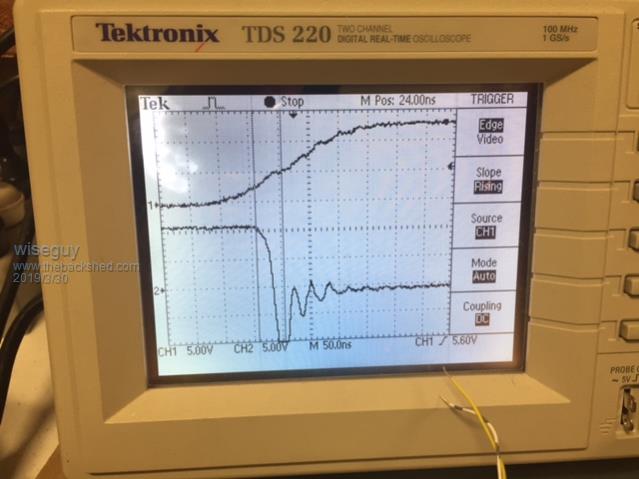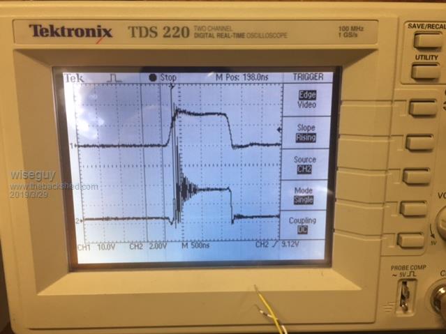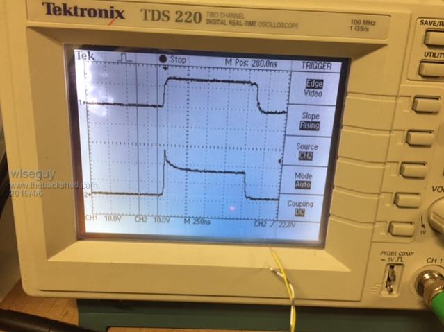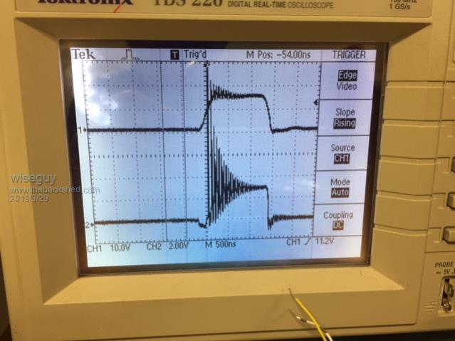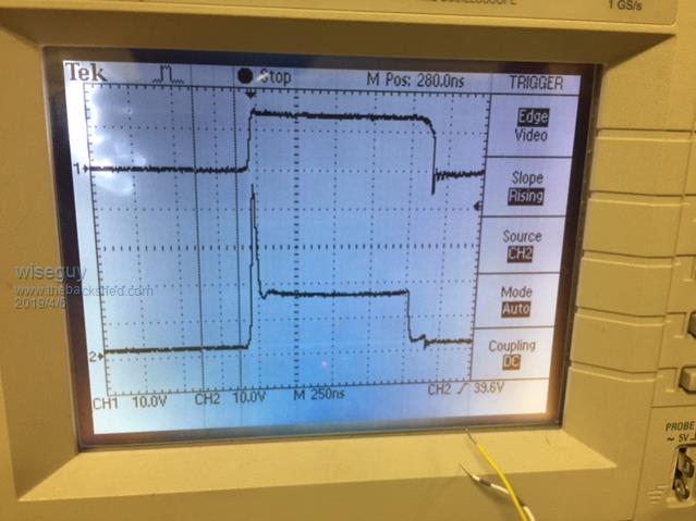 Here is a CRO shot of the crap that needed fixing. The top trace is the upper FET gate drive used for syncing the CRO. The bottom trace is the lower FET's Drain.