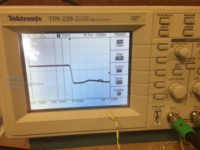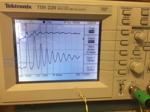 Here is an expanded view of the oscillations. Note the time cursors reveal a frequency of ~ 21MHz