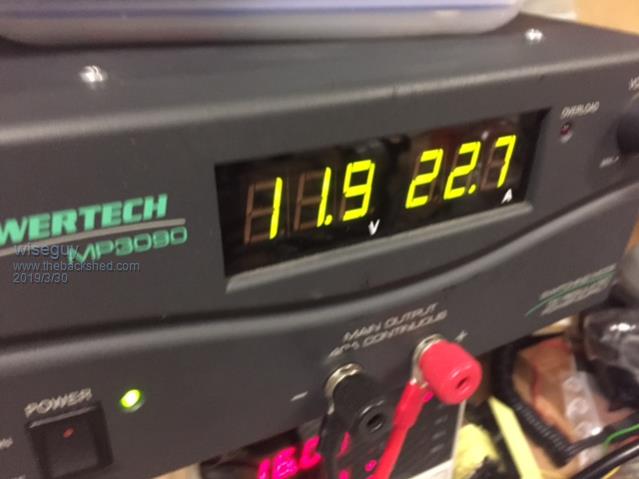 Lastly a picture of what happened to the supply current when I plugged in my Hakko desoldering tool as a test load. I probably should fit some heatsinks before driving it much harder.