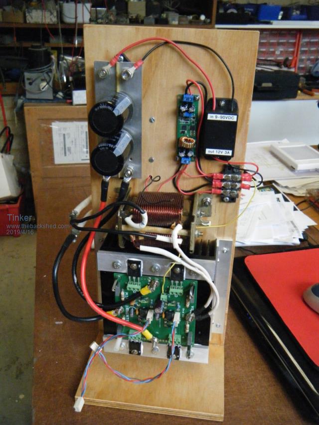 Now, in my experience, bench testing something that has many individual parts, like an inverter, requires a rats nest of wires an this resulting often in dubious connections. To avoid that, time spent to make a little plywood caddy, to fit all the parts, is well worth while.