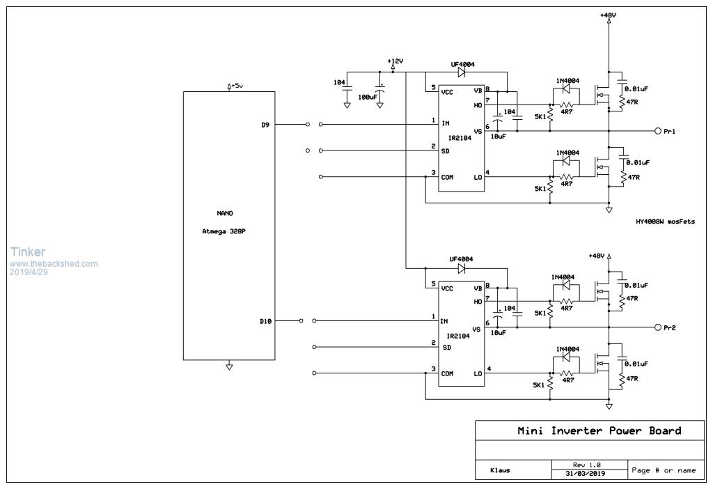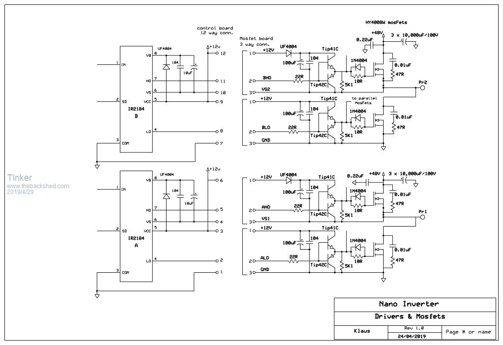 Cheers Mike And I agree with you Mike, yes I did just copy the totem pole arrangement I saw posted on this forum somewhere sometime ago. Can you suggest a suitable fast TO220 NPN, PNP replacement with a BCE pinout? If they are easy to get and not cost too much I'm happy to swap those slow transistors. What is odd is, the mad board's totem pole drivers appear to work with the nano board. Too bad there is no schematic (I do not do schematics I hear somebody mumble )available so I could check what's different.Mark, your suggestion of buying a mad power board is not being considered, this would involve re building the entire inverter from scratch .Klaus |