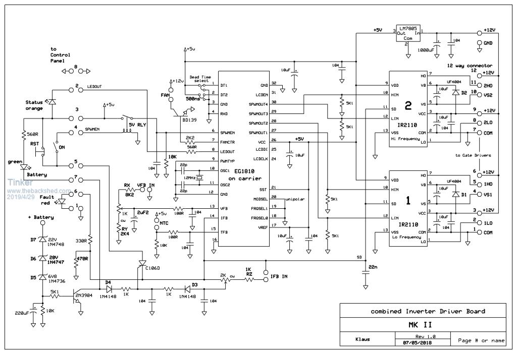 Has anybody tried that yet? I'm having no luck trying to swap the EG8010/IR2110 control board with my nano control board. This eats up HY4008's .I know my nano control board works, see inverter #5 thread. I know my EG8010 control board works - it has been running my inverters for quite some time now. So the problem must be with the totem pole drivers, the only thing that's different at the Mosfet side. Most likely I did something silly and just cannot spot it, so I'm eating humble pie and ask the esteemed collective expertise here for advise .This is the nano inverter without totem pole drivers: ![]() And here is the original EG8010/IR2110 control board. ![]() To be replaced by the nano board, the totem pole drivers are at the right side and these are the same the EG8010/IR2110 board connected to: ![]() Note the connections are done via a 12way header cable that has 4 x 3way headers at the far end. I use the same cable, making sure the connections on the new nano control board correspond. I copied the charge pump +12V supply as it was at the IR2110 drivers, did I go wrong there? Klaus |