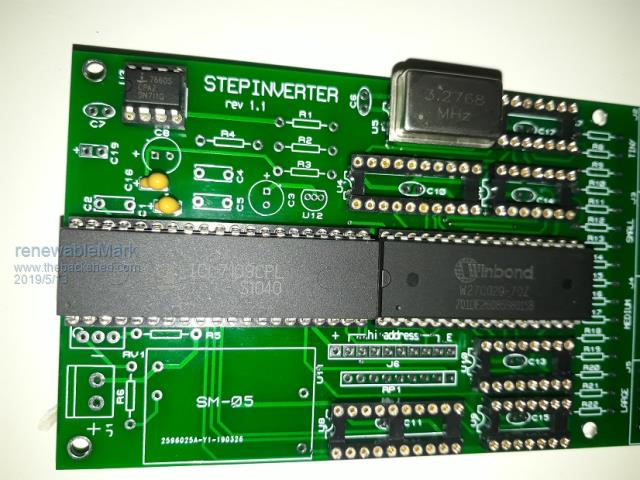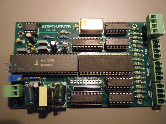 The original Step Inverter board revision 1.0 was only ever built as an initial prototype for myself to test some rather unusual ideas that I had. I built myself one board, and to my amazement it not only worked very first go, it worked very well indeed. So I loaded a second board to use as a spare, out of the five that were made. And that was the end of it as far as I was concerned. I had a working Warpverter, and I was now off grid with zero problems, and really happy. However there were some minor details in that prototype that could have been better, but after all it was a very first initial prototype. The first mistake was that I decided to add an extra 1uF tantalum capacitor to the +5v supply when I was laying out the board. I made that C25, but it should really have been C19 as the next component designator in sequence after C18. There was also some issue with C17, but cannot now remember exactly what that was. Second mistake was the polarity of C1 which has no + sign on the silk screen. Third mistake was that the hole sizes for the screw terminal blocks were made far too large. None of these mistakes stopped it from working, and I just soldered in the components without giving it any further thought. Suddenly and quite unexpectedly people were asking for boards, so I just sent out the revision 1.0 boards that I already had, with a correct bill of materials that listed C25 as 1uF and figuring that people would work out which way around C1 had to go. I then ordered ten more boards revision 1.1 with the three errors fixed. C25 became C19 as it should have been in the first place, and is a 1uF tantalum. Whatever the issue was with C17 being duplicated was also fixed. C1 gained the missing + on the silk screen. And the hole sizes for the screw terminal blocks were reduced in size. All the tracks and pads are fine. All of the issues really only concern component designators on the silk screen (and hole sizes). I still have a few of these rev 1.1 boards and pre programmed proms available if anyone is interested. The nano boards would be a better long term solution, but if you want to get something fairly basic working initially, this is arguably the very simplest way to get started. Cheers, Tony. |