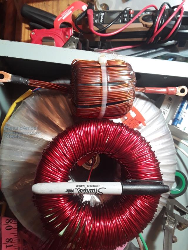 Did nobody see those ginormous ferrite choke ![]() I got worried that the wire wasn't big enough on the original one I made for my 10000 watt inverter board The little one in this pic is the first one I made it has 10 2 mm wires as one The big one has 16 in hand or whatever you call it made in one I hope that wires big enough I don't know how to do pie squared so 2mm is just the single measurement And it's round wire The Transformers wires are still way bigger yeah it has two 2awg wires in hand So four all together for the low side of the Transformer I am hoping to get 4 to 5000 watt continuous Even though I probably won't be using over 1500 watts most the time be warned i am good parrot but Dumber than a box of rocks |