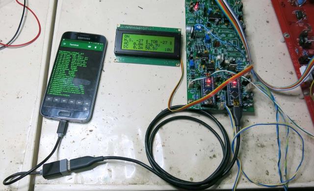 The LCD shows whats happening. I like using a laptop to do this comms since it is isolated from ground. Mark has found that using a PC, while that PC was powered by the running inverter can give poor results when setting the calibration values.