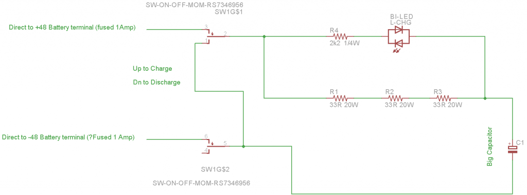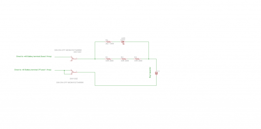 Ben, I've been meaning to do a little schematic snippet to show this. I put the two 33R 20W resistors in series. For 48v I'd use three of the above in series. The simple way to use an LED is to have a LED in series with a 2k 1/4W resistor, this goes in parallel with the power resistor. The led will turn OFF when the Caps are fully charged. The current to charge the caps this way is in the order of 0.5 Amp so wires and switches need only be light duty. Cheers Andrew |