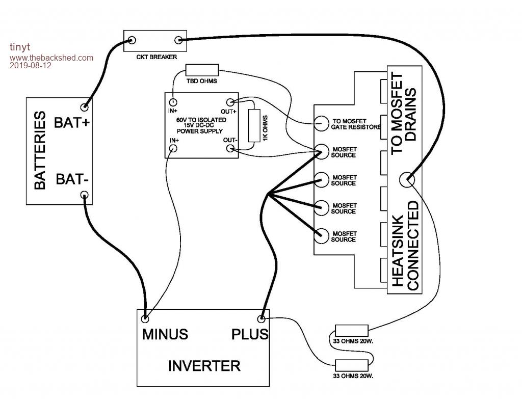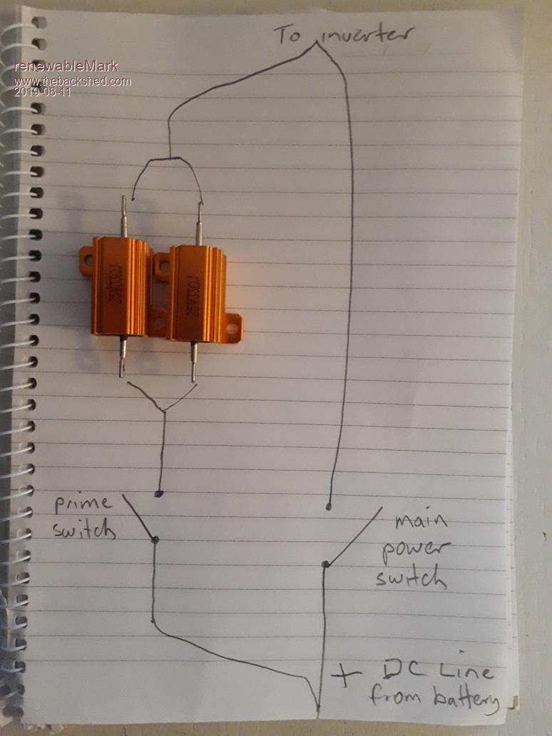 Ben, you can get the 33R finned resistors HERE One way to wire them is like the drawing. To start the inverter 1. Turn on the prime breaker, and leave for 30 seconds (to slowly charge up the caps). 2. Turn on the main DC supply breaker. 3. Turn off the prime breaker. ![]() I just used the same style DC breakers for both and fitted them next to each other on the case, with a label on each one, and the start up procedure written on it. Cheers Caveman Mark Off grid eastern Melb |