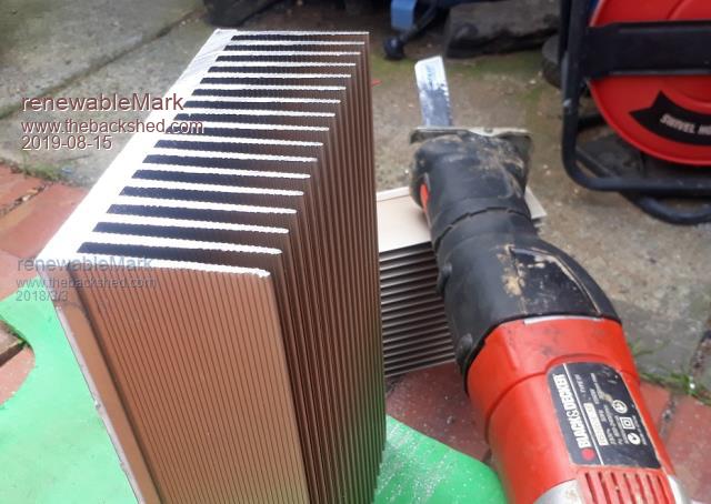 You can just use one of these reciprocating saws with a hacksaw metal type blade. That does a pretty ugly job but it works fine and the inverter won't care. ![]() Now I use a table saw with an aluminium blade. You get nicer cuts and it's just easier if you have access to a table saw. If you do it on a table saw beware of the blizzard of tiny filings that get flown EVERYWHERE. I put on full length overalls and use a welding mask (with the dark shade flipped up). Cheers Caveman Mark Off grid eastern Melb |