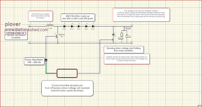 The idea is to switch at a suitable variable frequency, thus charge the capacitor. When this reaches say 20 kV stop the charge current when the spark gap conducts and the let the cap discharge.