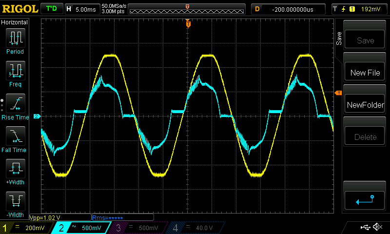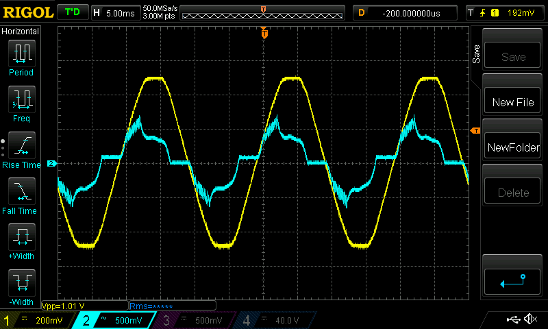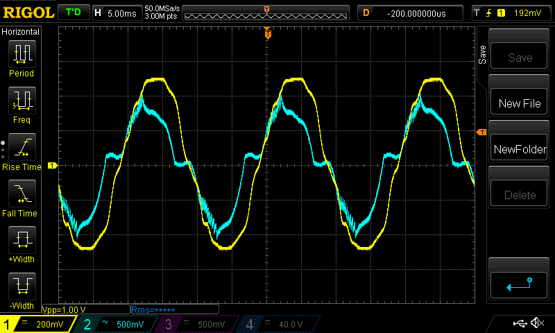 Notice the distorted AC voltage waveform. It seems to me the inverter is supplying