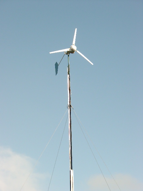 A couple of hours later and I was watching a good north-westerly putting 13 amps at 50V into my batteries. (650 watts - that's nearly 50 amps into a 12V system). Anemometer shows it was only 30-35 kmh wind too. The mast still has a slight shake but nothing like the moster rattle it had before!