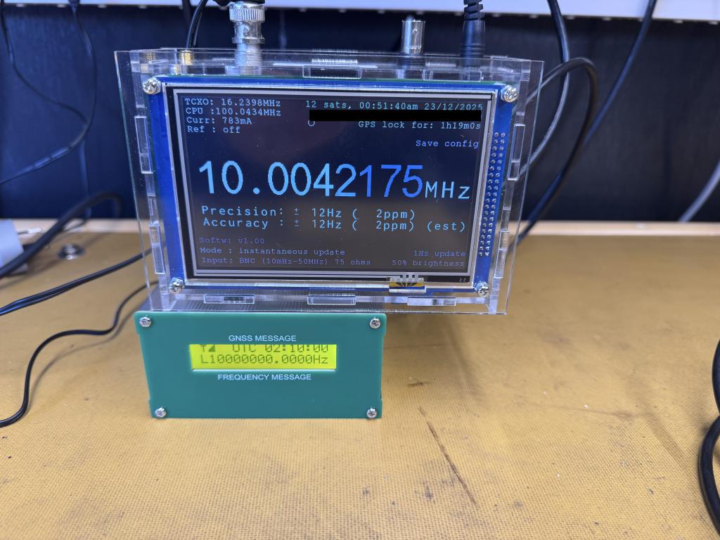 Hi Doug, I have built one and even though it works as described i have found a couple of problems. 1. The sensitivity of the BNC input at low frequencies especially below 100KHz to be very poor. It even starts dropping off from about 1MHz. the lower you go you end up driving the input up to 2-3V sine wave to get any accurate reading. There is no problem with a square wave. Thinking it may be noise from the supply upsetting the TL3016I IC6 as there is some switching noise present which is raising the noise floor of the input. 2. The mmbasic code had some divide by 0 errors which caused the program to hang with the GPS attached after 15 minutes. The program is a bit of a minefield and being not very good with mmbasic I fed it through ChatGPT. To its credit it did find all the problems eventually with a bit of prompting. So now at least it runs constantly with the GPS. This has improved the accuracy greatly but not quite as i hopped. I have one of the Tamed GPS oscillators with a 10MHz output and using it as the GPS source via the NMEA serial and 1PPS I can plug that into the counter. It eventually after an hour it settles down adjusting the TCXO too much and reads around 10KHz high. The revised code still does a small glitch every 15min or so which surprisingly gets the counter within about 1-2Khz but it slowly drifts out, maybe temperature related, so I will have to look into that. Anyway i will keep plodding away. If anything its a good learning experience. As far as finding any other info available, i have had no luck other than your post. See a couple of pics for interest. and the revised code Cheers peter. FreqCounter6GHz_Fixed_GPS_Hangs.bas.zip Edited 2025-12-23 12:59 by walshpj64 |