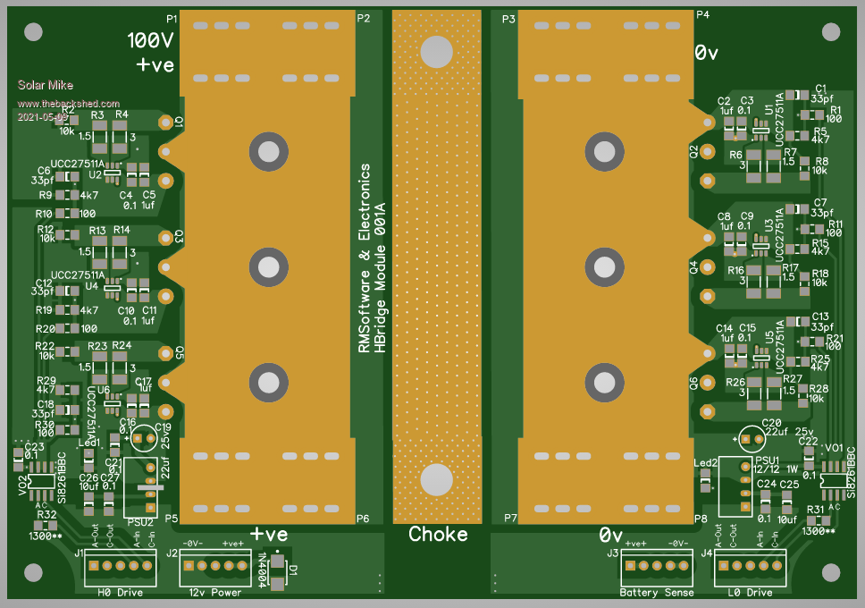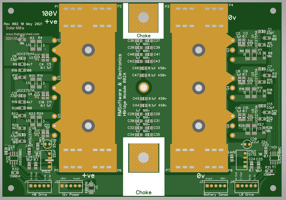 The board above could be simplified by using less mosfets and perhaps having a single isolated driver chip for each Upper and lower halves; then using greater numbers of modules connected in parallel to get the required output power, the chokes would then be much smaller.