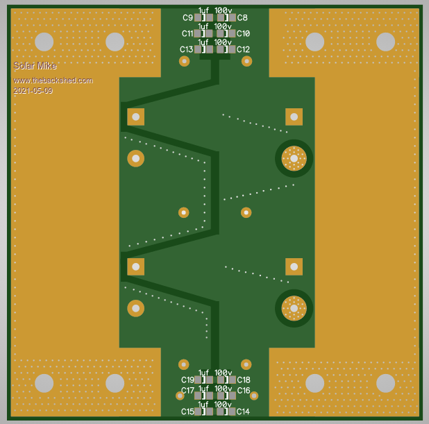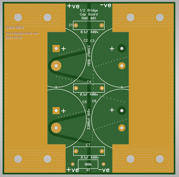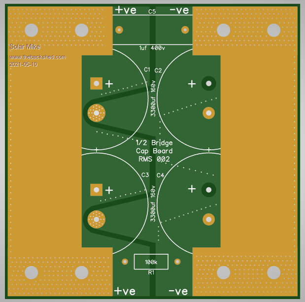 Already I can see an error, will post the Cap pcb next, it bolts across the top, with 4 connection points for each power rail, then draw up the schematic showing how they can be combined.