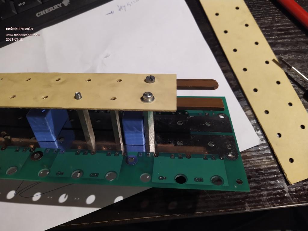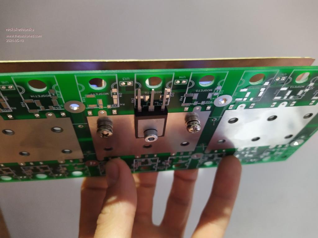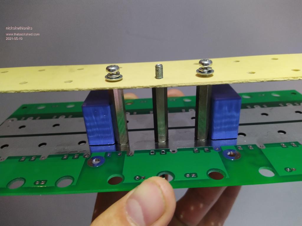 Choke copper bar if used, was placed on top as it wouldn't fit under the board without lengthening the mosfet leads, longer leads = more inductance.