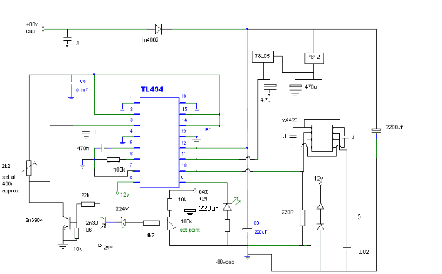 replaced battery with 80v 10,000uf cap ...the 47R resistor was added after the 470n cap started to swell